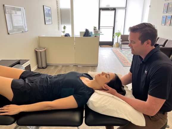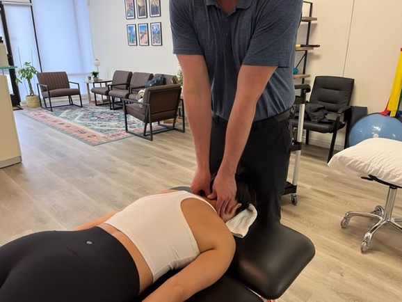 Posture related pain is often referred to as “Upper Crossed Syndrome”. It is extremely common and we are seeing more and more of it in physical therapy. This is because people are spending more time at the computer and on their phone where they are spending prolonged periods of time in postural compromise looking down at a screen. As humans we naturally have a muscle imbalance in our upper body. The muscles in our upper body that rotate and pull our shoulders and neck forward (our traps, pecs, SCM, and lats) are a lot bigger and stronger overall than the muscles that reinforce good posture (rotator cuff, rhomboids, mid trap/low trap, cervical deep neck flexors). This causes an imbalance where people tend to be rounded or hunched forward when they stand or sit (why most people lean over a table or desk when you look at them in an office setting, restaurant, etc). As this persists for a long period of time people can develop spinal mobility issues, increased muscle tension and tightness within the neck and mid back, and headaches amongst other symptoms. Upper Crossed Syndrome can present itself in different ways depending on the person. One person may have headaches, one may have feelings of neck stiffness, another may have feelings of pain in their upper traps, others may have feelings of stiffness in their mid back. Or people may have a combination of symptoms all related to the same condition. Treatment for upper crossed syndrome tends to get excellent results in physical therapy. Treatment typically involves using hands on therapy to alleviate muscle tightness and stiffness within the spine, and following that with posture related exercises to prevent recurrences of pain. Below are some pictures of techniques we use to treat posture related pain in our clinic. If you would like to schedule an appointment please reach out to us.